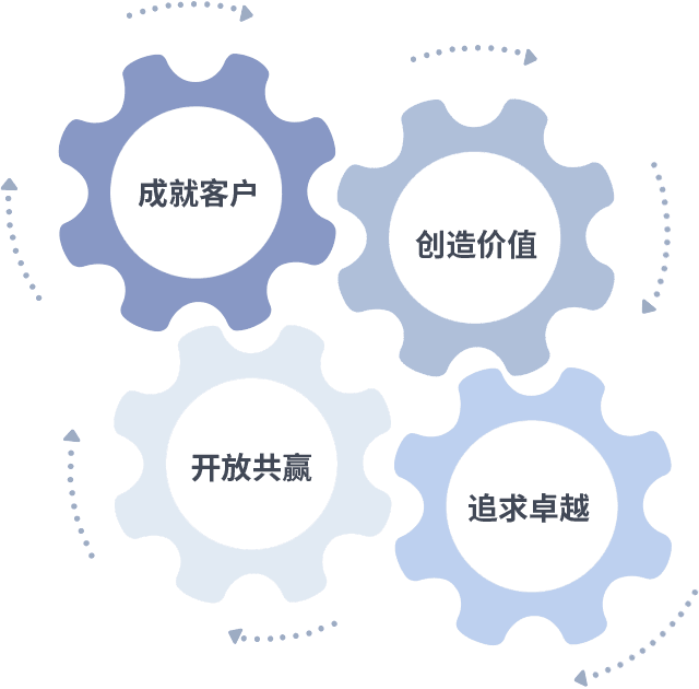 成就客户是一切决策的出发点,,创造价值是衡量所有工作的标准,,,,追求卓越是我们做事做人的态度,,,开放共赢是我们的格局也是最终的结果。。。价值观的齿轮环环相扣,,,推动着组织里的每个人不断向前。。